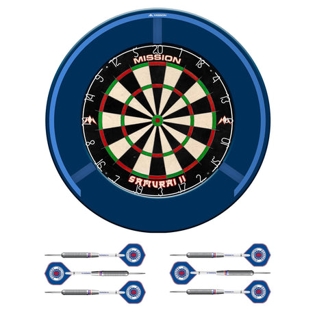Mission Samurai Infinity Dartboard Set - Dart Board, Surround, Torus 270 Light & 2 sets of Brass Darts - Blue