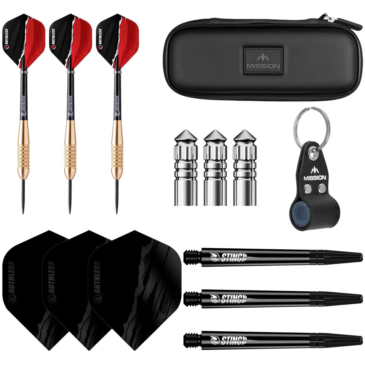 Be match-ready with the Beginners Darts Gift Set With Darts, Case & Accessories. Included in this pack is a set of 18g Ruthless Eagles Brass Darts, plus a spare set of Ruthless Riptorn Black Flights and Ruthless Sting Medium Black Stems, and a set of Mission F-Protect Flight Protectors. Make sure your points are always in the best condition with a Mission Sharpener and keep your darts safe inside a Mission Freedom Slim Black Darts Case, which are both included in this darts gift set!