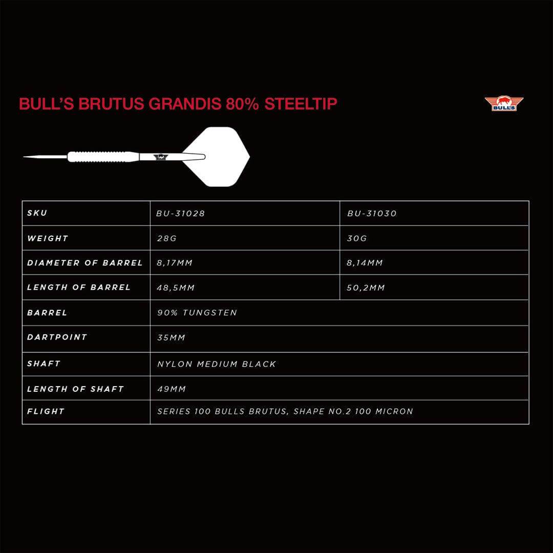 Bulls Brutus Darts - Steel Tip - 80% Tungsten - Grandis - 28g is backordered and will ship as soon as it is back in stock.