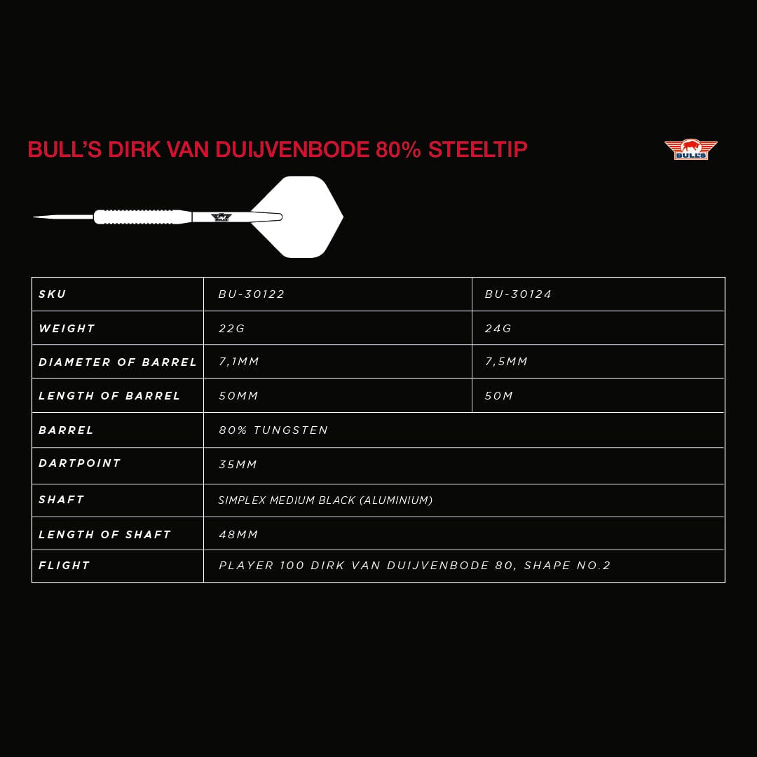 Bulls Dirk van Duijvenbode Darts - Steel Tip - 80% Tungsten - 22g is backordered and will ship as soon as it is back in stock.
