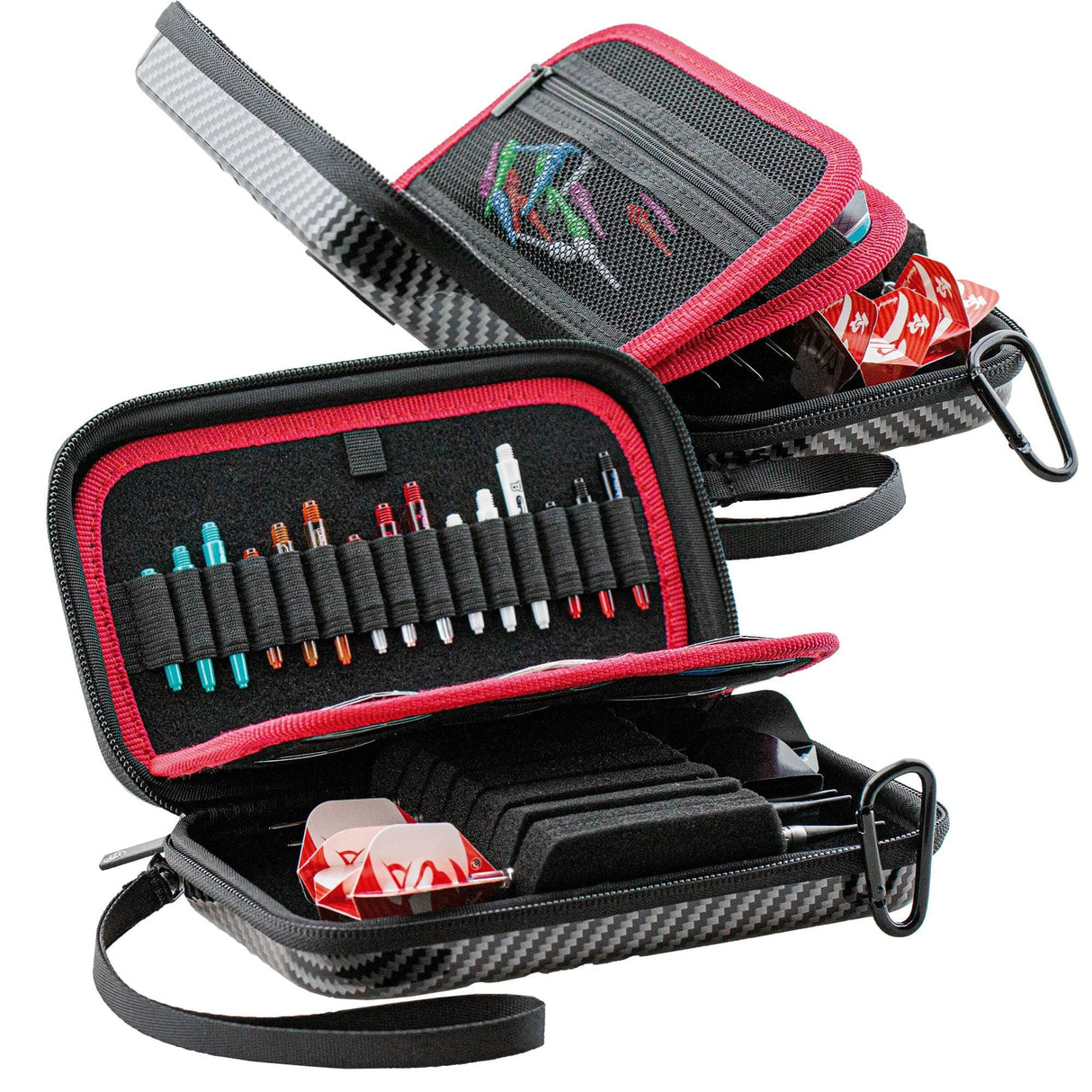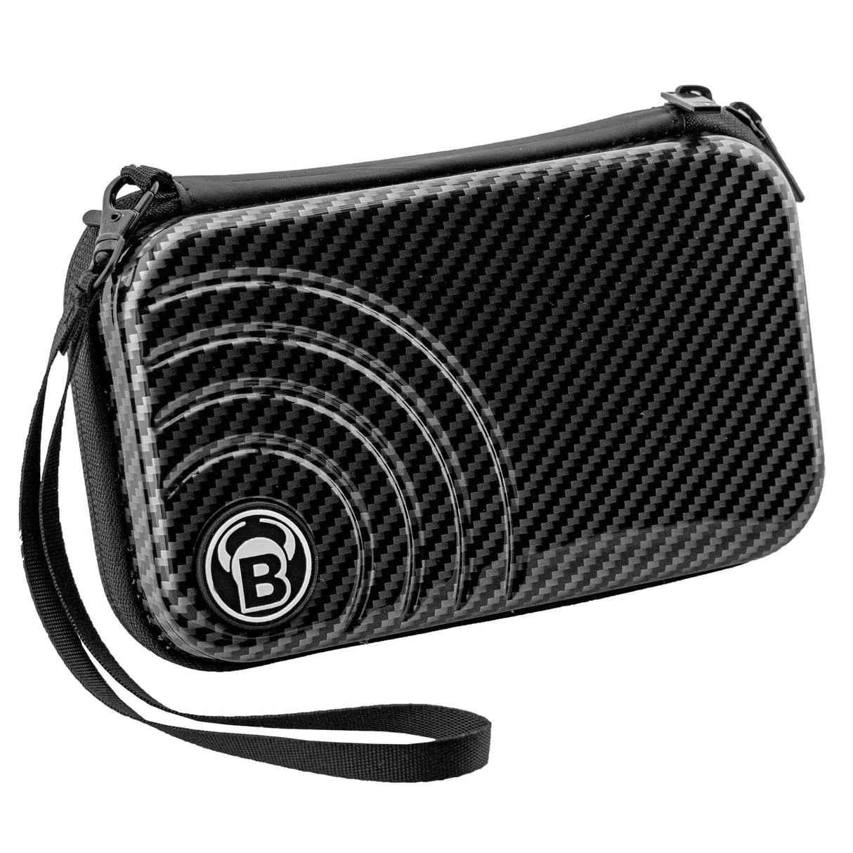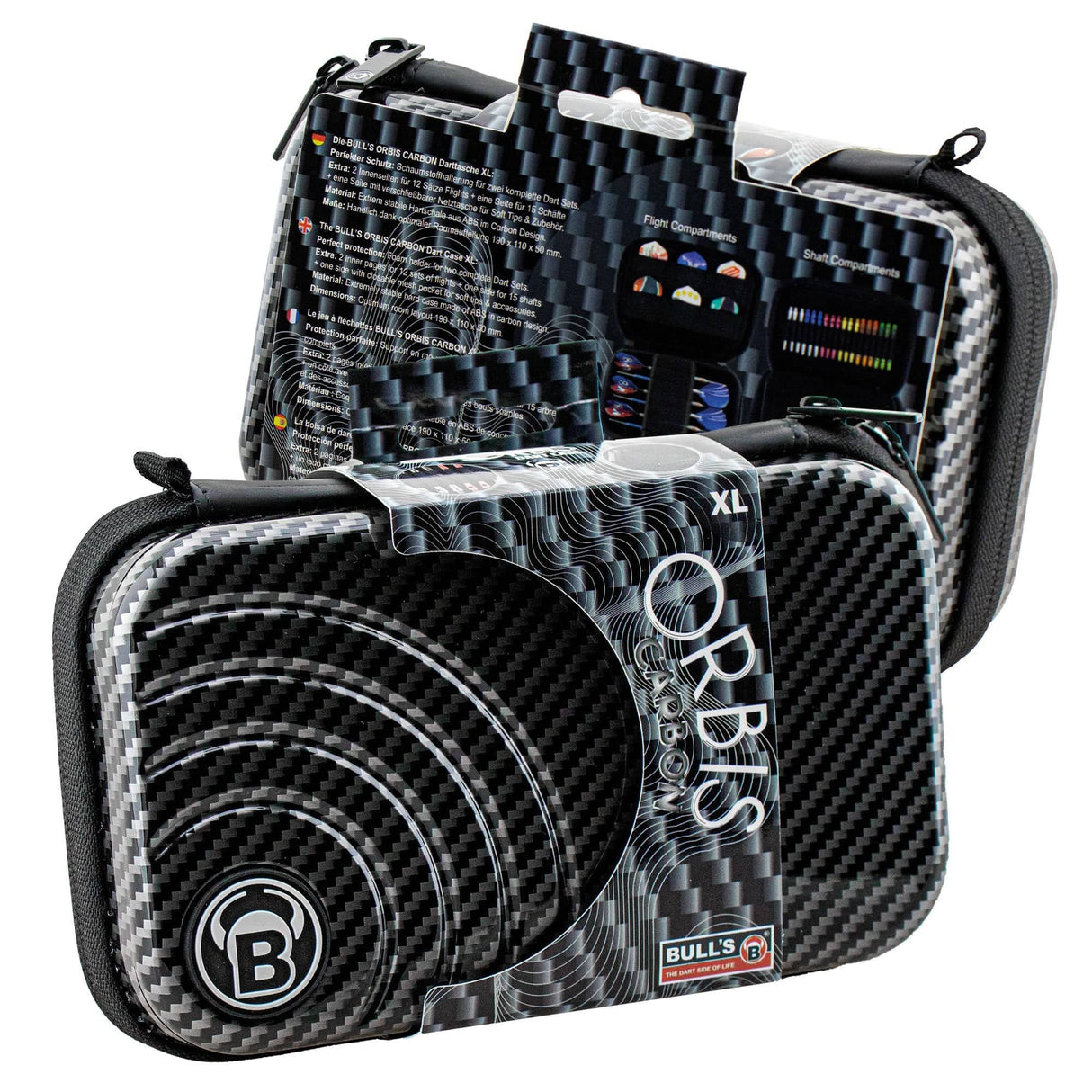 BULL'S Orbis Carbon Grey HS XL Dart Case. The Bulls Orbis case now comes in new carbon design Dimensions: 190 x 110 x 50 mm and includes a foam holder for two complete sets of darts, as well as two inner sides for 12 sets of flights. One side has holders for 15 shafts and the other side has a closable mesh pocket for soft tips & accessories.
