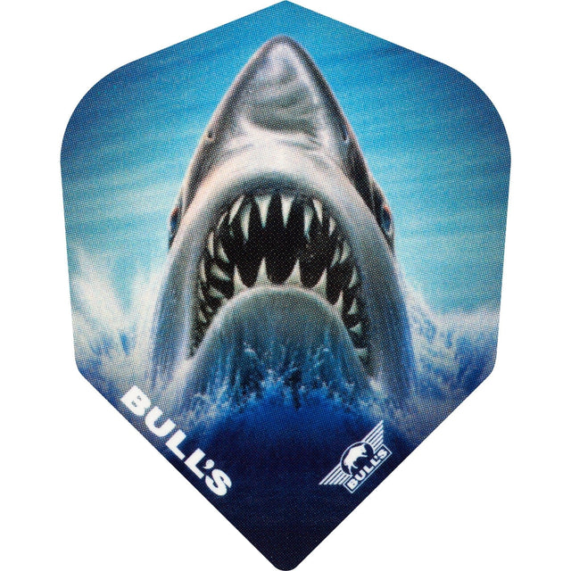 Bulls Powerflite Strong Dart Flights.100 Micron. No 6. An essential for any darts players kit. This high quality dart flight comes in a standard No 6 shape and is 100 microns thick to ensure it lasts a long time. This pack comes in a Blue colour and features a large Shark Design, with Bulls logo across two of the edges. Each pack contains 3 flights