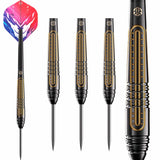 The Caliburn steel tip darts collection includes plenty of designs with darts in black titanium, gold and blue coatings to cater for the preferences of every player. The Caliburn Sandy II Dart is a visually striking dart from this range and is made from a premium 95% tungsten. This dart features a straight barrel with a ring grip and gold coating at the front and a dot grip and black coating at the rear, to cater for players who hold the dart at the front or rear of the dart.