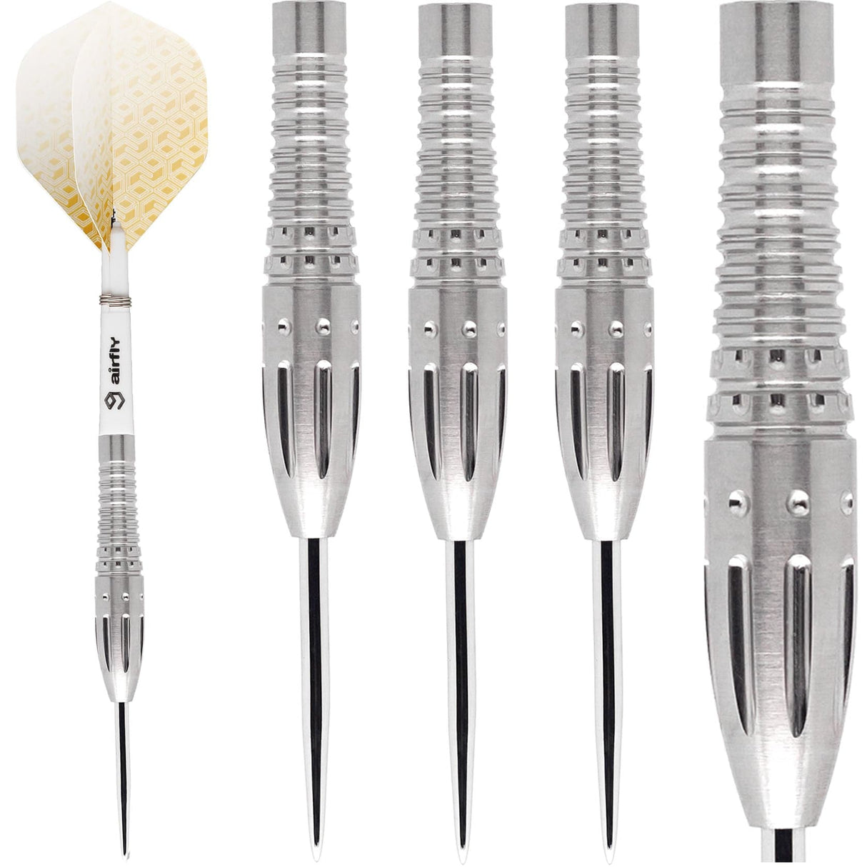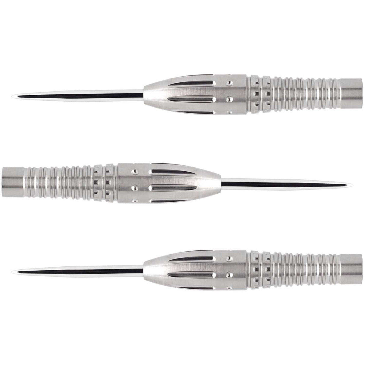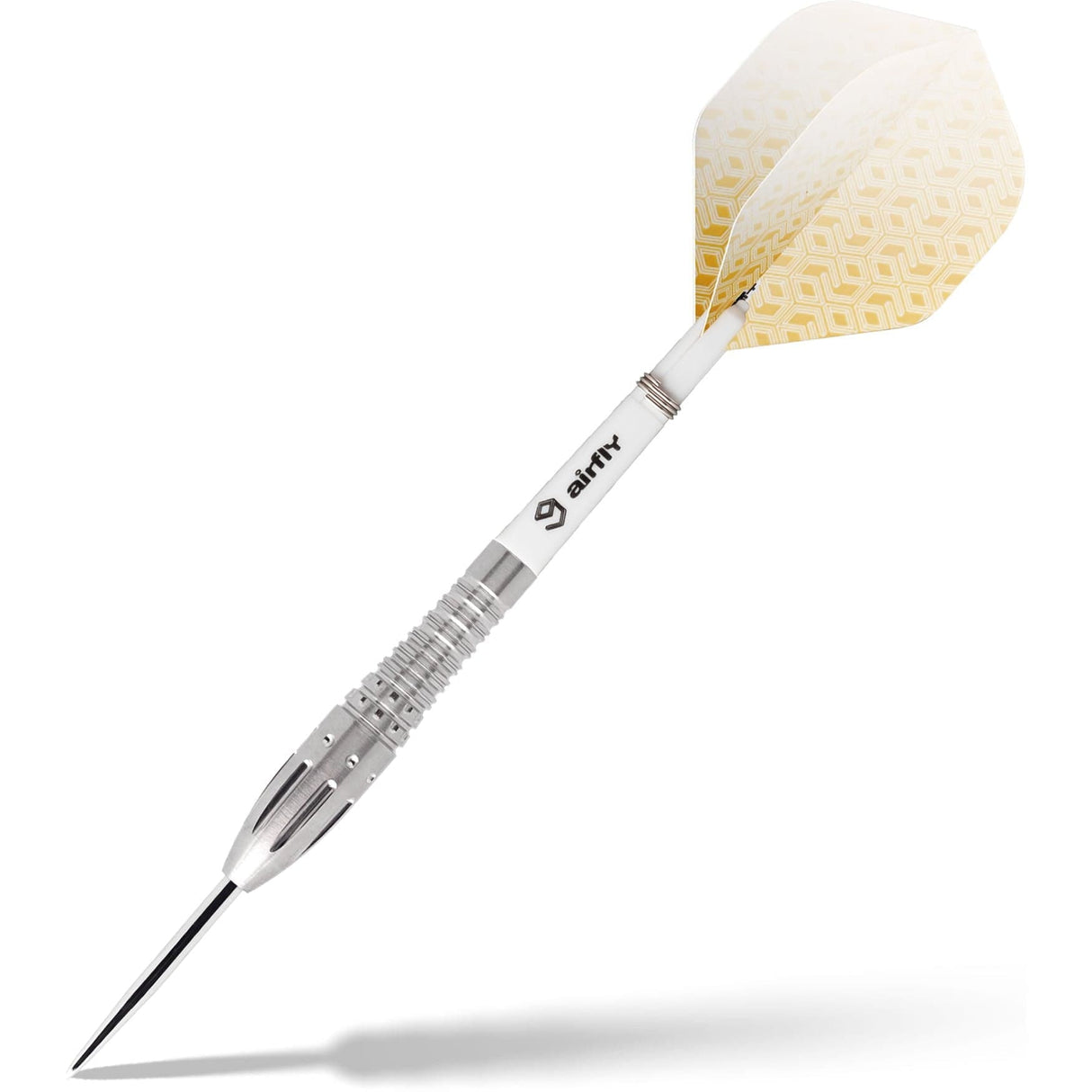 The Caliburn steel tip darts collection includes plenty of designs with darts in black titanium, gold and blue coatings to cater for the preferences of every player. The Caliburn Sandy II Dart is a visually striking dart from this range and is made from a premium 95% tungsten. This dart features a straight barrel with a ring grip and gold coating at the front and a dot grip and black coating at the rear, to cater for players who hold the dart at the front or rear of the dart.