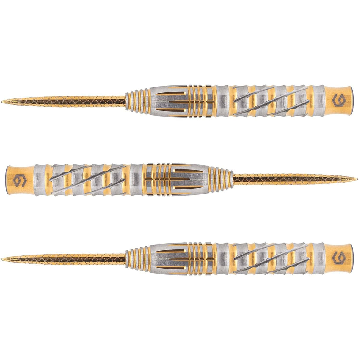 The Caliburn steel tip darts collection includes plenty of designs with darts in black titanium, gold and blue coatings to cater for the preferences of every player. The Caliburn Sandy II Dart is a visually striking dart from this range and is made from a premium 95% tungsten. This dart features a straight barrel with a ring grip and gold coating at the front and a dot grip and black coating at the rear, to cater for players who hold the dart at the front or rear of the dart.