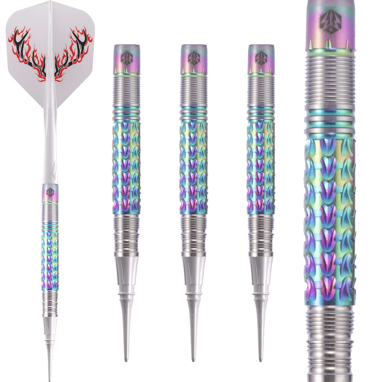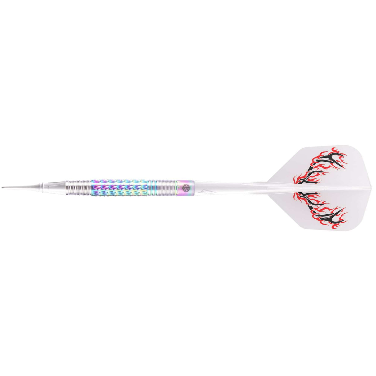 The range of Caliburn soft tip darts has some exciting options in 90% tungsten and 95% tungsten, with the Caliburn Raine Dart a favourite of ours at Darts Corner. This dart is made of a premium 95% tungsten and really stands out from the rest with a rainbow coating on the barrels. The straight barrel design also has milled cuts along the ring sections of the barrel, offering players plenty of grip.