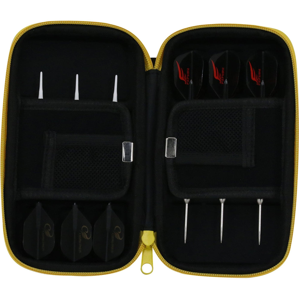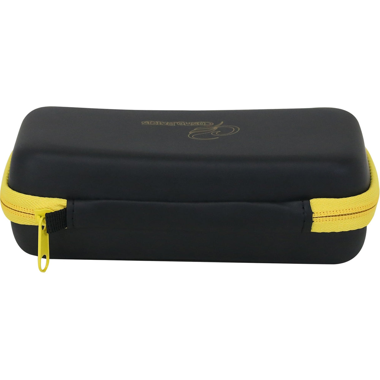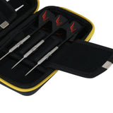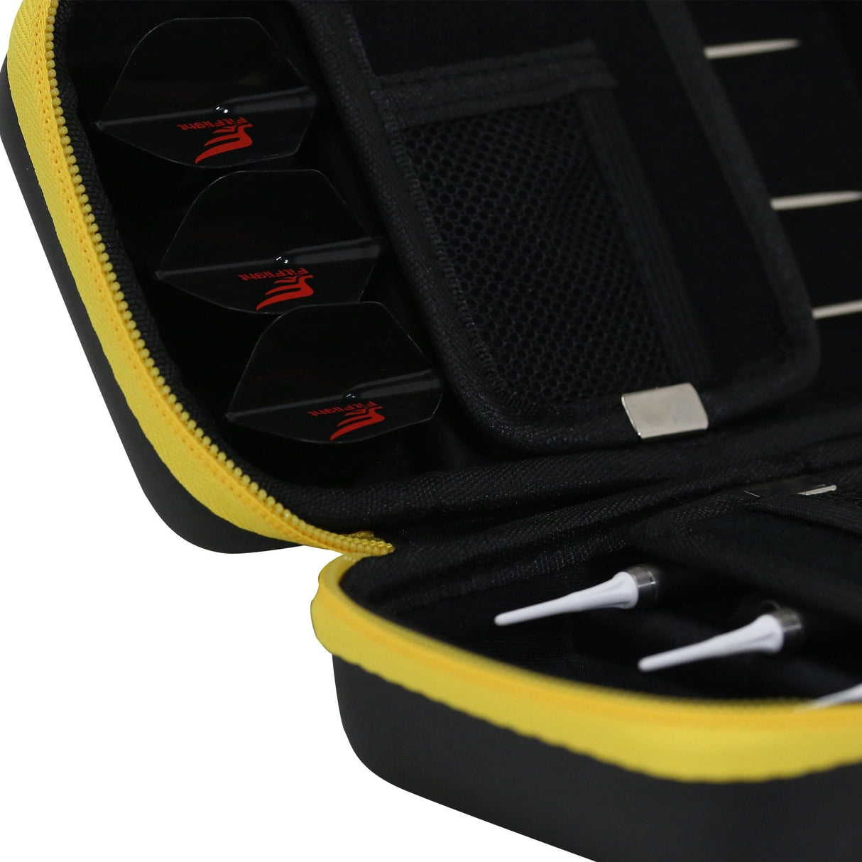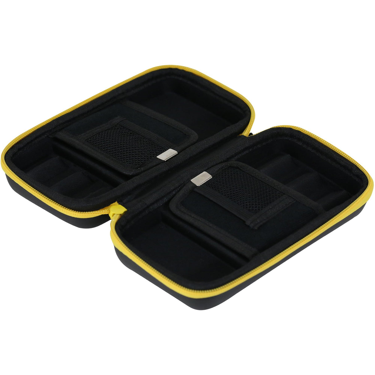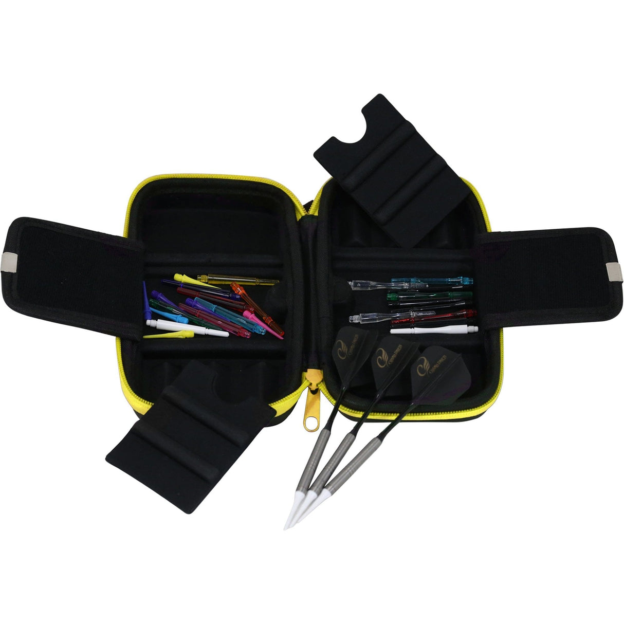 Cosmo Darts Clutch Neon Yellow Colour Trim Duo Dart Wallet - C16 - Large EVA Darts Case. Keep you kit safe and secure with this large darts case, perfect for 2 sets of fully assembled darts. This case comes in an all Black colour with Neon Yellow trim and a gold Cosmo Darts logo and zip fastening.