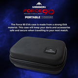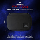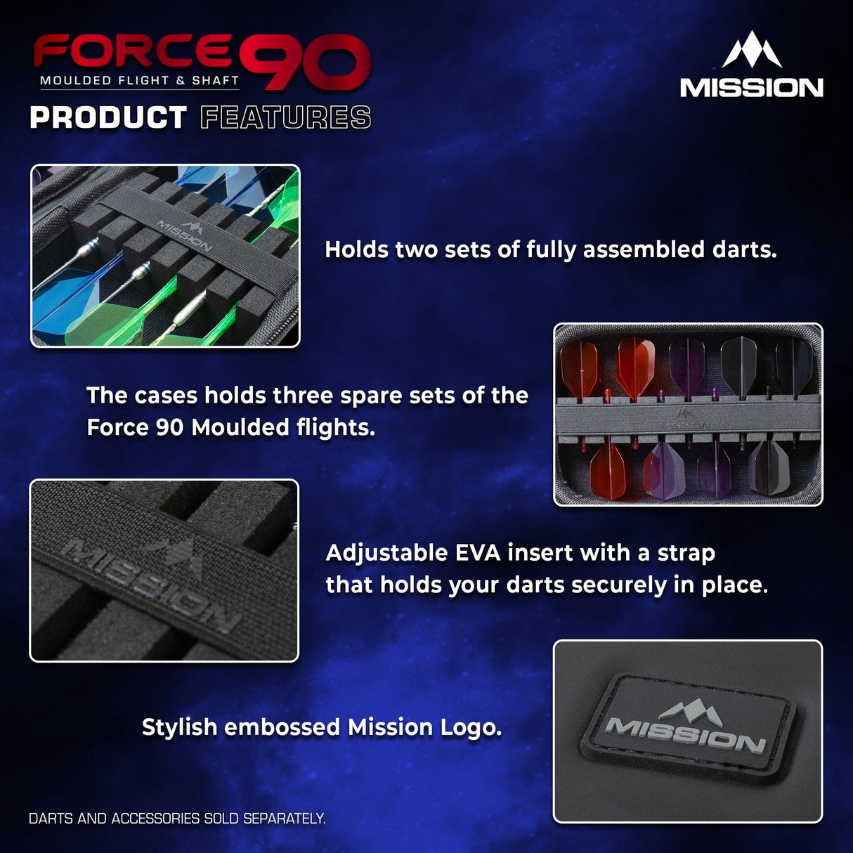 Mission Force 90 Dart Case - EVA Moulded Wallet - Large. Keep your darts equipment safe and secure with the Mission Force 90 EVA Dart Case. Made from a strong EVA material, this case will keep your darts and accessories secure for when you are on the move and travelling to your next darts match. This darts case can hold two sets of fully assembled darts on one side, along with a specifically designed compartment on the other side to hold spare Mission Force 90 flights. Darts and flights are not included.