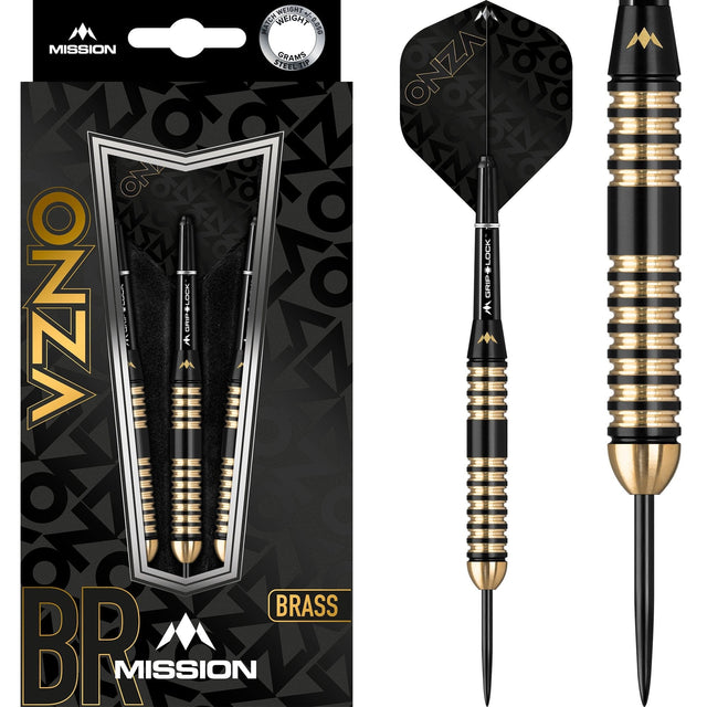 Mission Onza Steel Tip Brass Darts - Twin Machined. Features: Black Coated Brass Barrels, 1 Set of Mission Flights, 1 Set of Mission Shafts with S-Lock rings, Point Protector. Mission Onza Darts - Steel Tip Brass - M4 - Black & Gold - 24g-D1578 Great Value Set