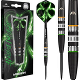 The barrel leads to a Mission Sabre shaft in black which tightly grips the flight. The dart is complete with a black point and the Mission logo is laser-etched into the rear of the barrel.