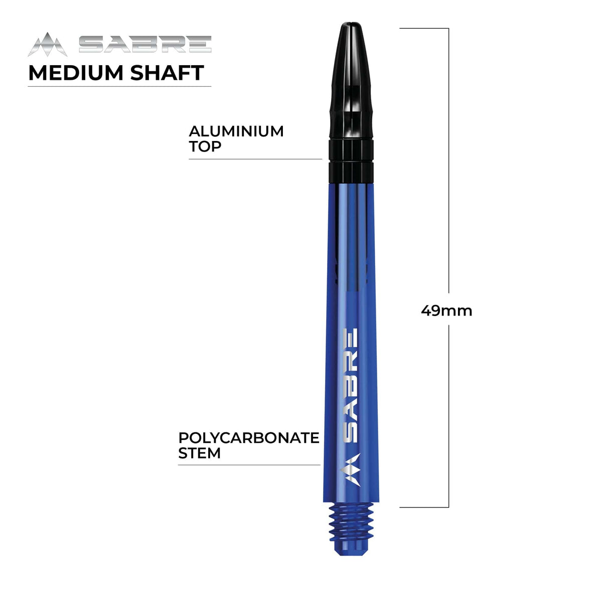 The Mission Sabre Dart Shafts combine the lightness and strength of polycarbonate with the flight-grip of Aluminium shafts. The Sabre shafts are made from a strong black Polycarbonate material, encasing an Aluminium core and fixed top. The Aluminium tops enhance the grip of the flight and are available in a choice of six colours (black, blue, gold, green red and silver). The shafts are available in four sizes: Small (36mm), Tweenie (40mm), Tweenie Plus (44.5m) and Medium (49mm). Please note that sizes do not include the thread. Each pack contains three shafts. Mission Sabre Shafts - Polycarbonate Dart Stems - Blue - Black Top - Medium