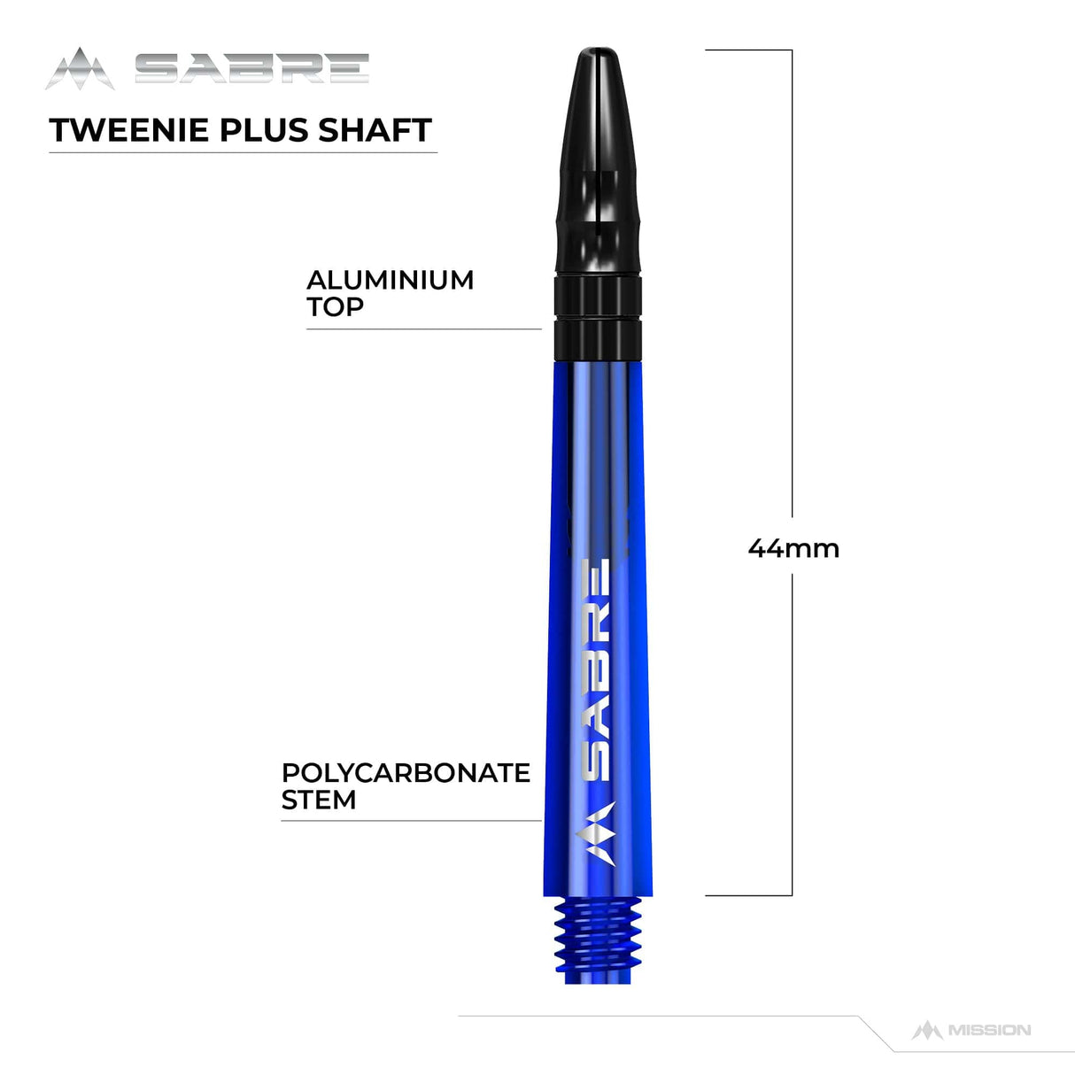 The Mission Sabre Dart Shafts combine the lightness and strength of polycarbonate with the flight-grip of Aluminium shafts. The Sabre shafts are made from a strong black Polycarbonate material, encasing an Aluminium core and fixed top. The Aluminium tops enhance the grip of the flight and are available in a choice of six colours (black, blue, gold, green red and silver). The shafts are available in four sizes: Small (36mm), Tweenie (40mm), Tweenie Plus (44.5m) and Medium (49mm). Please note that sizes do not include the thread. Each pack contains three shafts. Mission Sabre Shafts - Polycarbonate Dart Stems - Blue - Black Top - Tweenie Plus