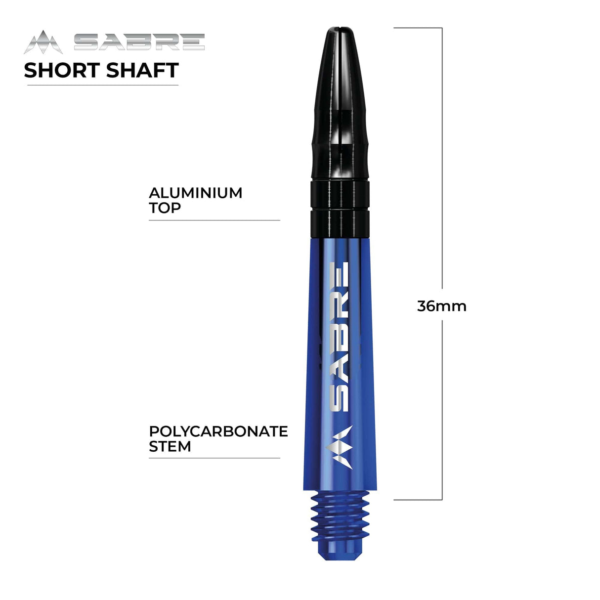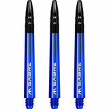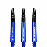 The Mission Sabre Dart Shafts combine the lightness and strength of polycarbonate with the flight-grip of Aluminium shafts. The Sabre shafts are made from a strong black Polycarbonate material, encasing an Aluminium core and fixed top. The Aluminium tops enhance the grip of the flight and are available in a choice of six colours (black, blue, gold, green red and silver). The shafts are available in four sizes: Small (36mm), Tweenie (40mm), Tweenie Plus (44.5m) and Medium (49mm). Please note that sizes do not include the thread. Each pack contains three shafts. Mission Sabre Shafts - Polycarbonate Dart Stems - Blue - Black Top - Short