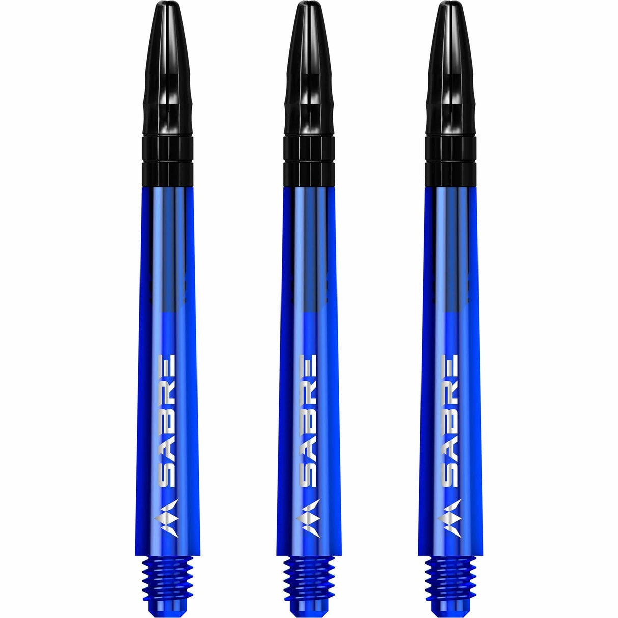 The Mission Sabre Dart Shafts combine the lightness and strength of polycarbonate with the flight-grip of Aluminium shafts. The Sabre shafts are made from a strong black Polycarbonate material, encasing an Aluminium core and fixed top. The Aluminium tops enhance the grip of the flight and are available in a choice of six colours (black, blue, gold, green red and silver). The shafts are available in four sizes: Small (36mm), Tweenie (40mm), Tweenie Plus (44.5m) and Medium (49mm). Please note that sizes do not include the thread. Each pack contains three shafts. Mission Sabre Shafts - Polycarbonate Dart Stems - Blue - Black Top - Tweenie