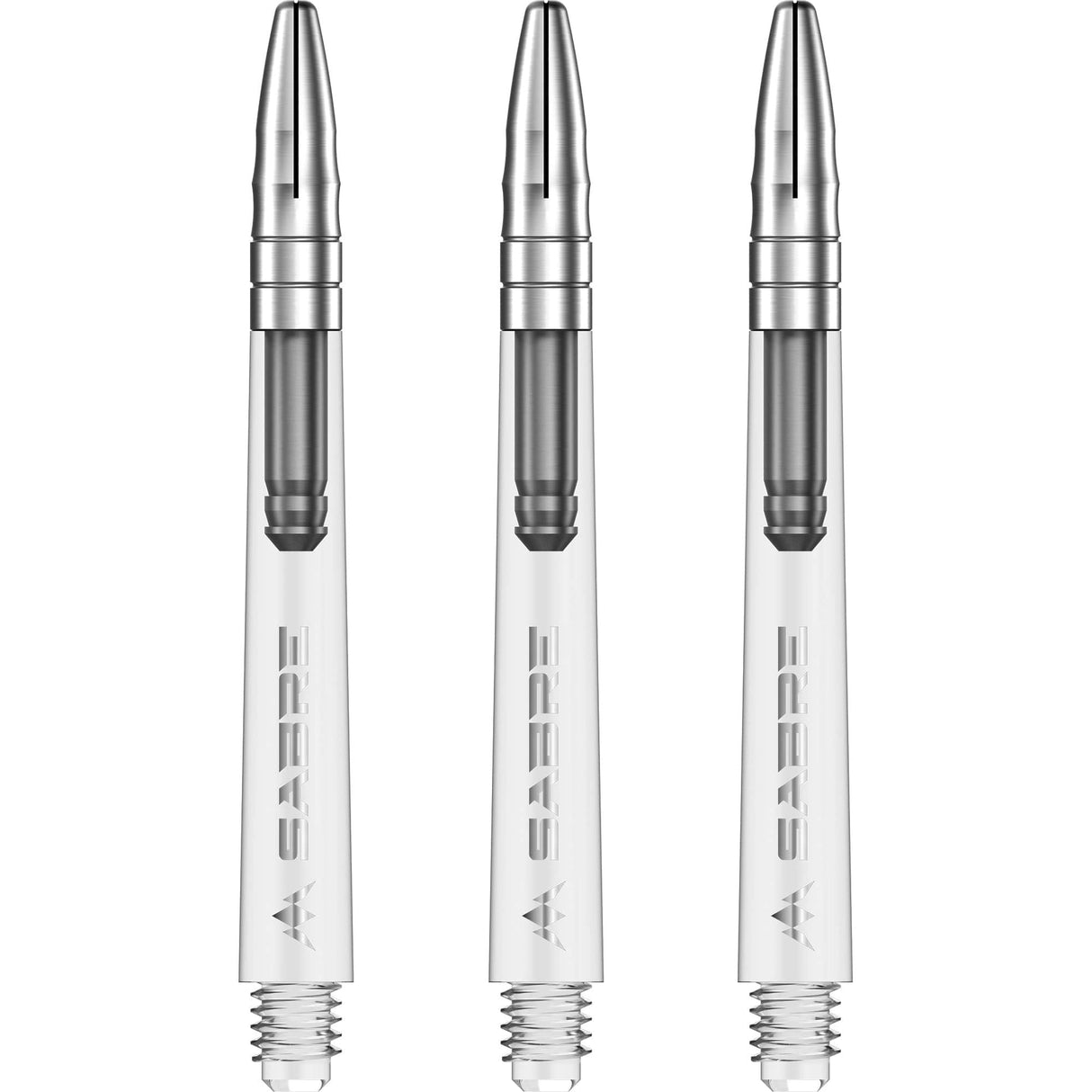 The Mission Sabre Dart Shafts combine the lightness and strength of polycarbonate with the flight-grip of Aluminium shafts. The Sabre shafts are made from a strong black Polycarbonate material, encasing an Aluminium core and fixed top. The Aluminium tops enhance the grip of the flight and are available in a choice of six colours (black, blue, gold, green red and silver). The shafts are available in four sizes: Small (36mm), Tweenie (40mm), Tweenie Plus (44.5m) and Medium (49mm). Please note that sizes do not include the thread. Each pack contains three shafts. Mission Sabre Shafts - Polycarbonate Dart Stems - Clear - Silver Top - Short