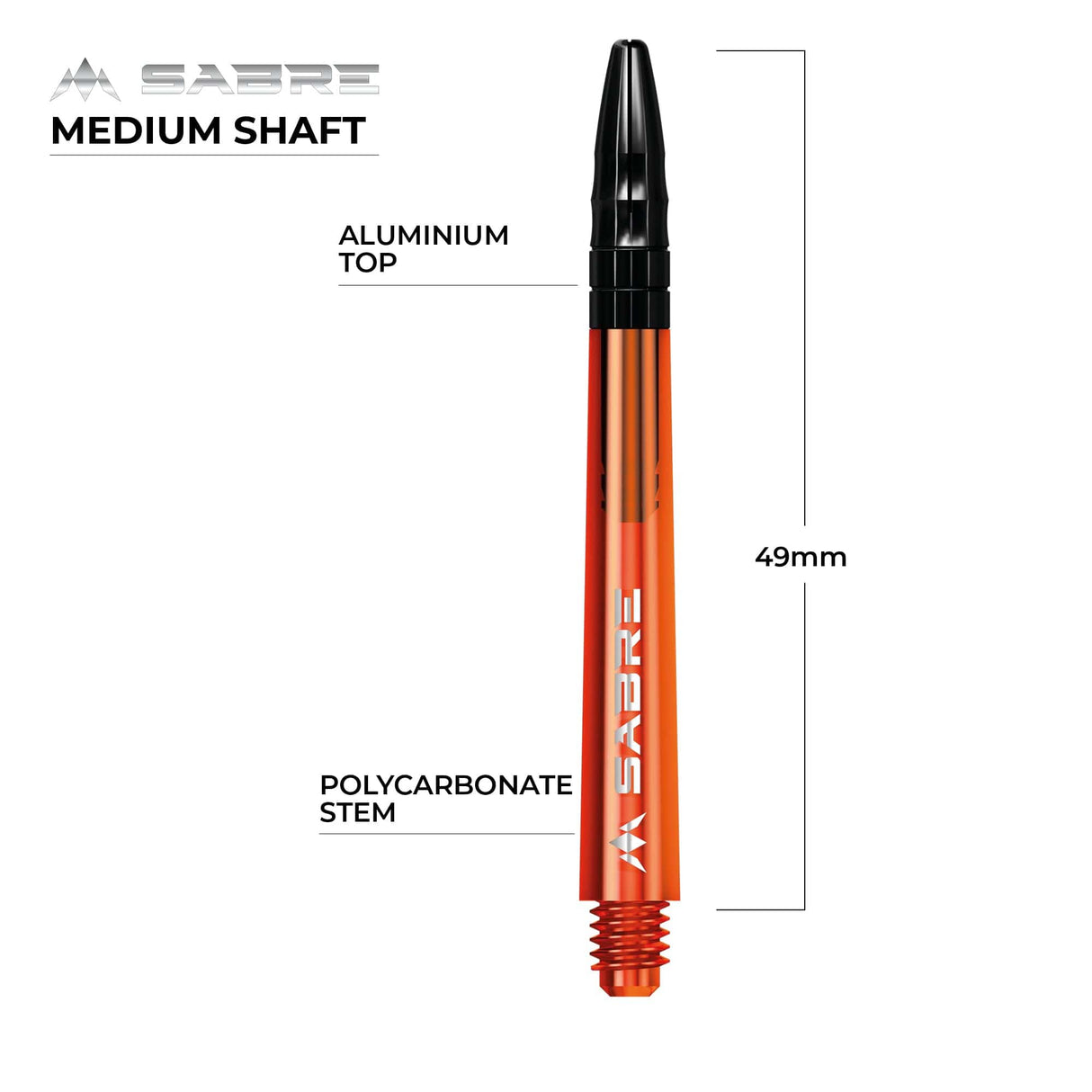 The Mission Sabre Dart Shafts combine the lightness and strength of polycarbonate with the flight-grip of Aluminium shafts. The Sabre shafts are made from a strong black Polycarbonate material, encasing an Aluminium core and fixed top. The Aluminium tops enhance the grip of the flight and are available in a choice of six colours (black, blue, gold, green red and silver). The shafts are available in four sizes: Small (36mm), Tweenie (40mm), Tweenie Plus (44.5m) and Medium (49mm). Please note that sizes do not include the thread. Each pack contains three shafts. Mission Sabre Shafts - Polycarbonate Dart Stems - Orange - Black Top - Medium