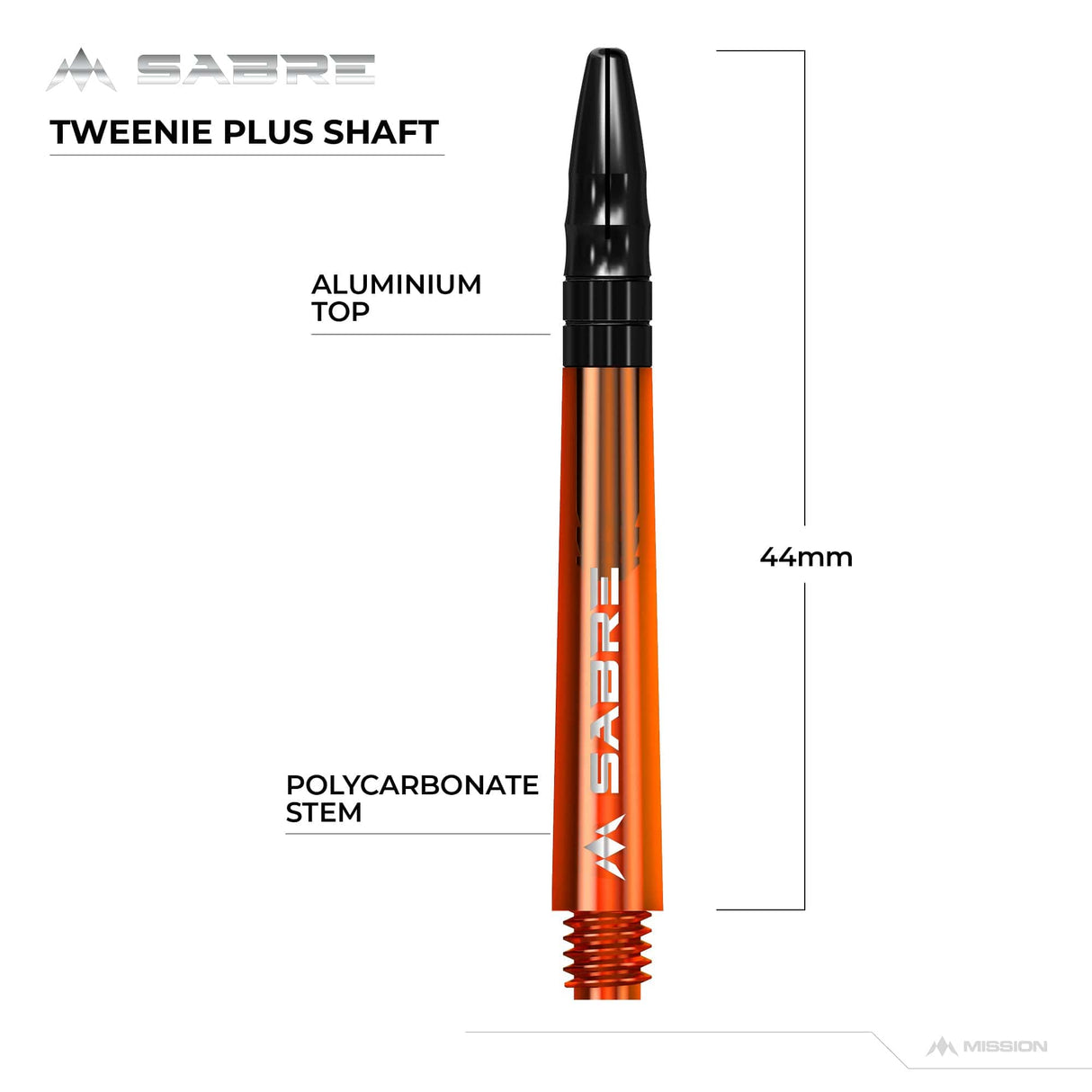 The Mission Sabre Dart Shafts combine the lightness and strength of polycarbonate with the flight-grip of Aluminium shafts. The Sabre shafts are made from a strong black Polycarbonate material, encasing an Aluminium core and fixed top. The Aluminium tops enhance the grip of the flight and are available in a choice of six colours (black, blue, gold, green red and silver). The shafts are available in four sizes: Small (36mm), Tweenie (40mm), Tweenie Plus (44.5m) and Medium (49mm). Please note that sizes do not include the thread. Each pack contains three shafts. Mission Sabre Shafts - Polycarbonate Dart Stems - Orange - Black Top - Tweenie Plus