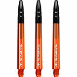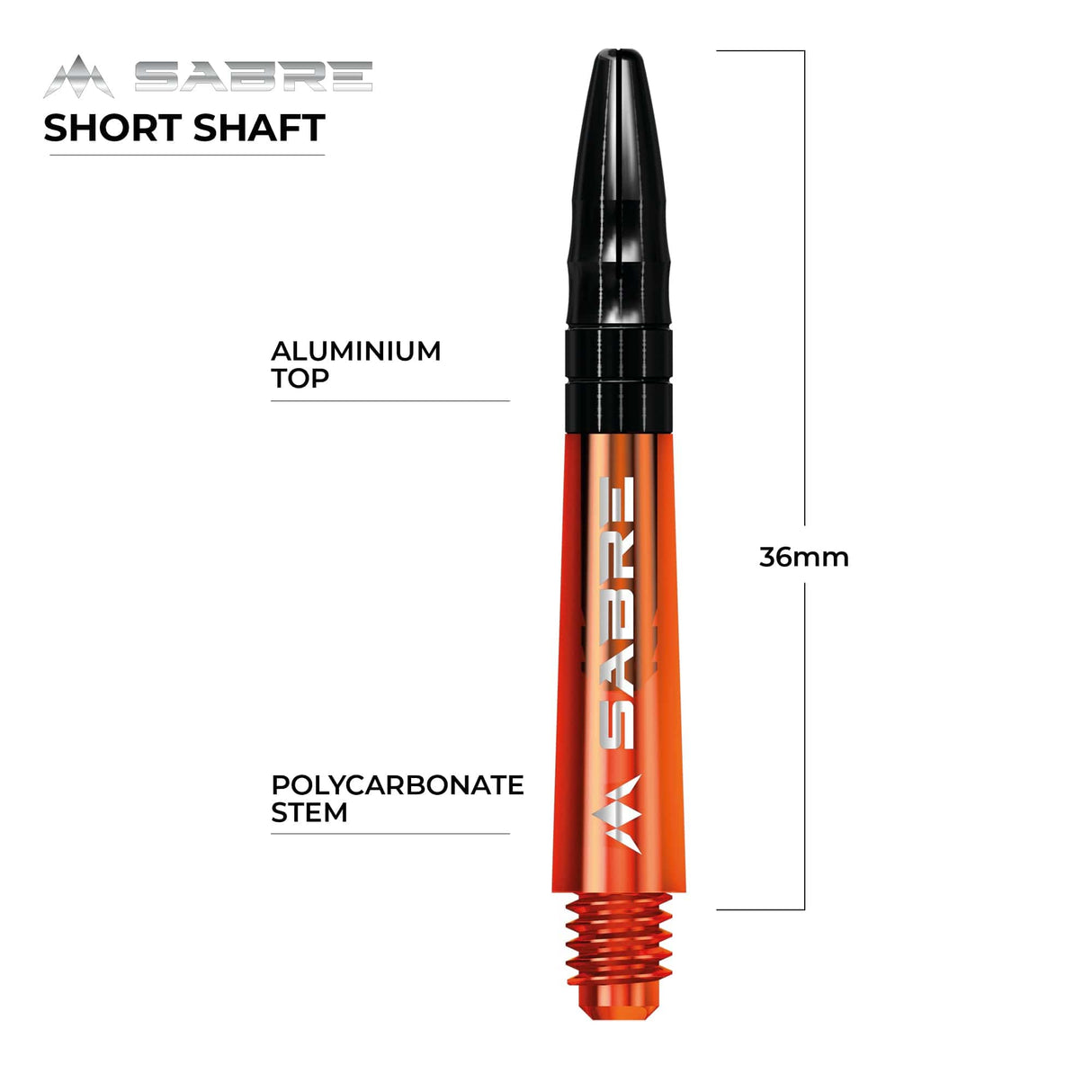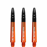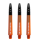 The Mission Sabre Dart Shafts combine the lightness and strength of polycarbonate with the flight-grip of Aluminium shafts. The Sabre shafts are made from a strong black Polycarbonate material, encasing an Aluminium core and fixed top. The Aluminium tops enhance the grip of the flight and are available in a choice of six colours (black, blue, gold, green red and silver). The shafts are available in four sizes: Small (36mm), Tweenie (40mm), Tweenie Plus (44.5m) and Medium (49mm). Please note that sizes do not include the thread. Each pack contains three shafts. Mission Sabre Shafts - Polycarbonate Dart Stems - Orange - Black Top - Short