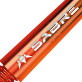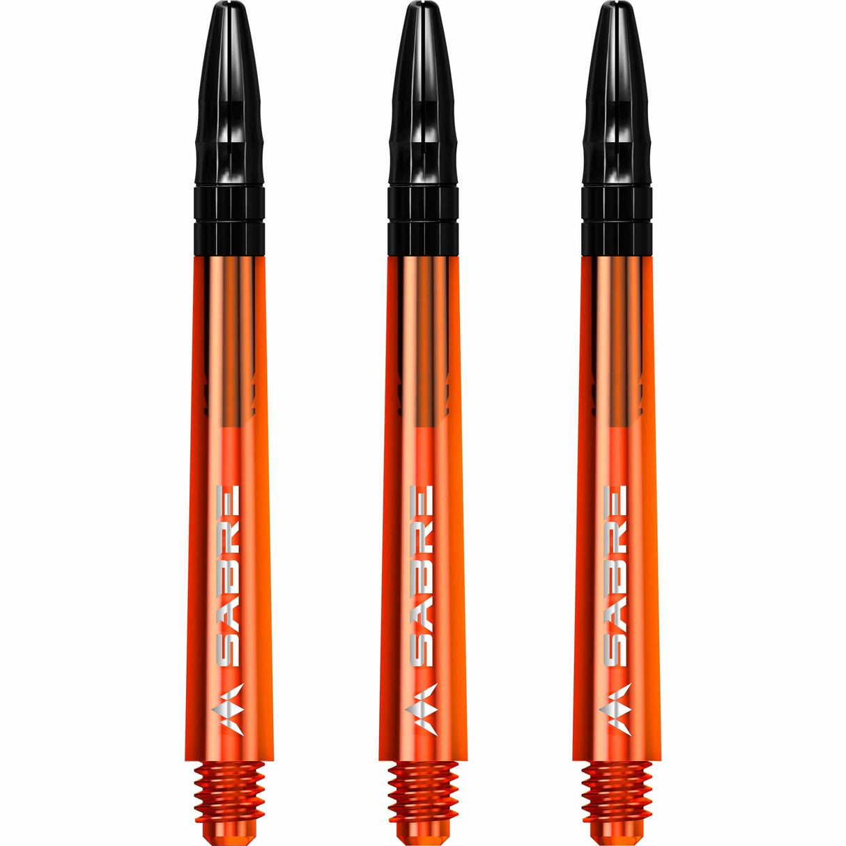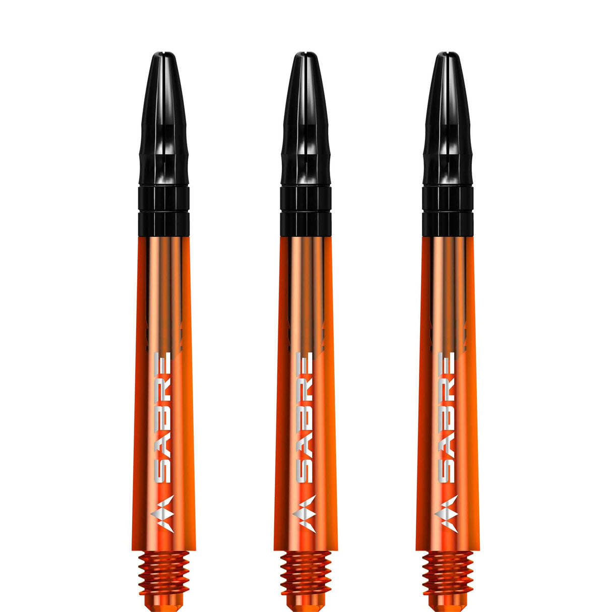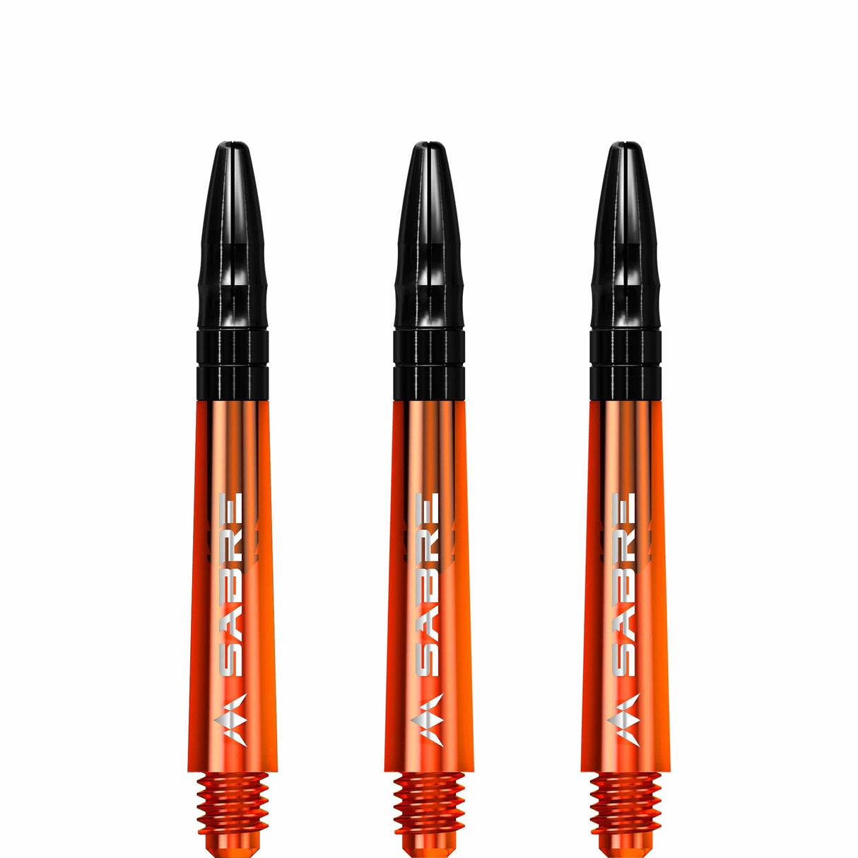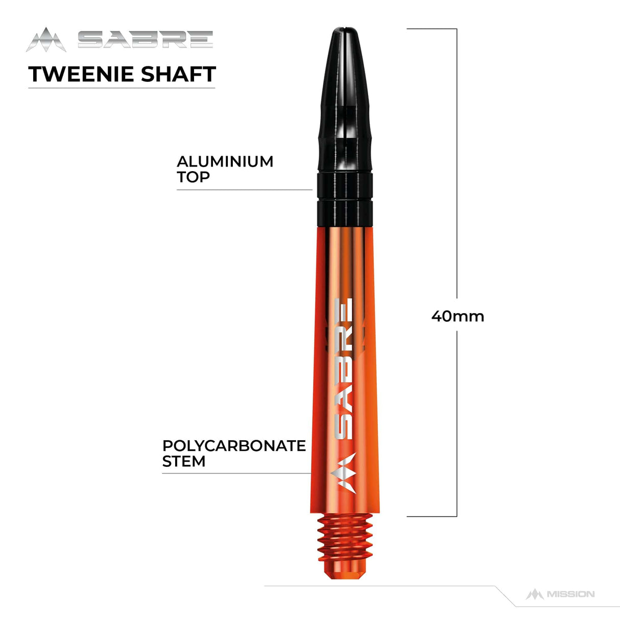 The Mission Sabre Dart Shafts combine the lightness and strength of polycarbonate with the flight-grip of Aluminium shafts. The Sabre shafts are made from a strong black Polycarbonate material, encasing an Aluminium core and fixed top. The Aluminium tops enhance the grip of the flight and are available in a choice of six colours (black, blue, gold, green red and silver). The shafts are available in four sizes: Small (36mm), Tweenie (40mm), Tweenie Plus (44.5m) and Medium (49mm). Please note that sizes do not include the thread. Each pack contains three shafts. Mission Sabre Shafts - Polycarbonate Dart Stems - Orange - Black Top - Tweenie