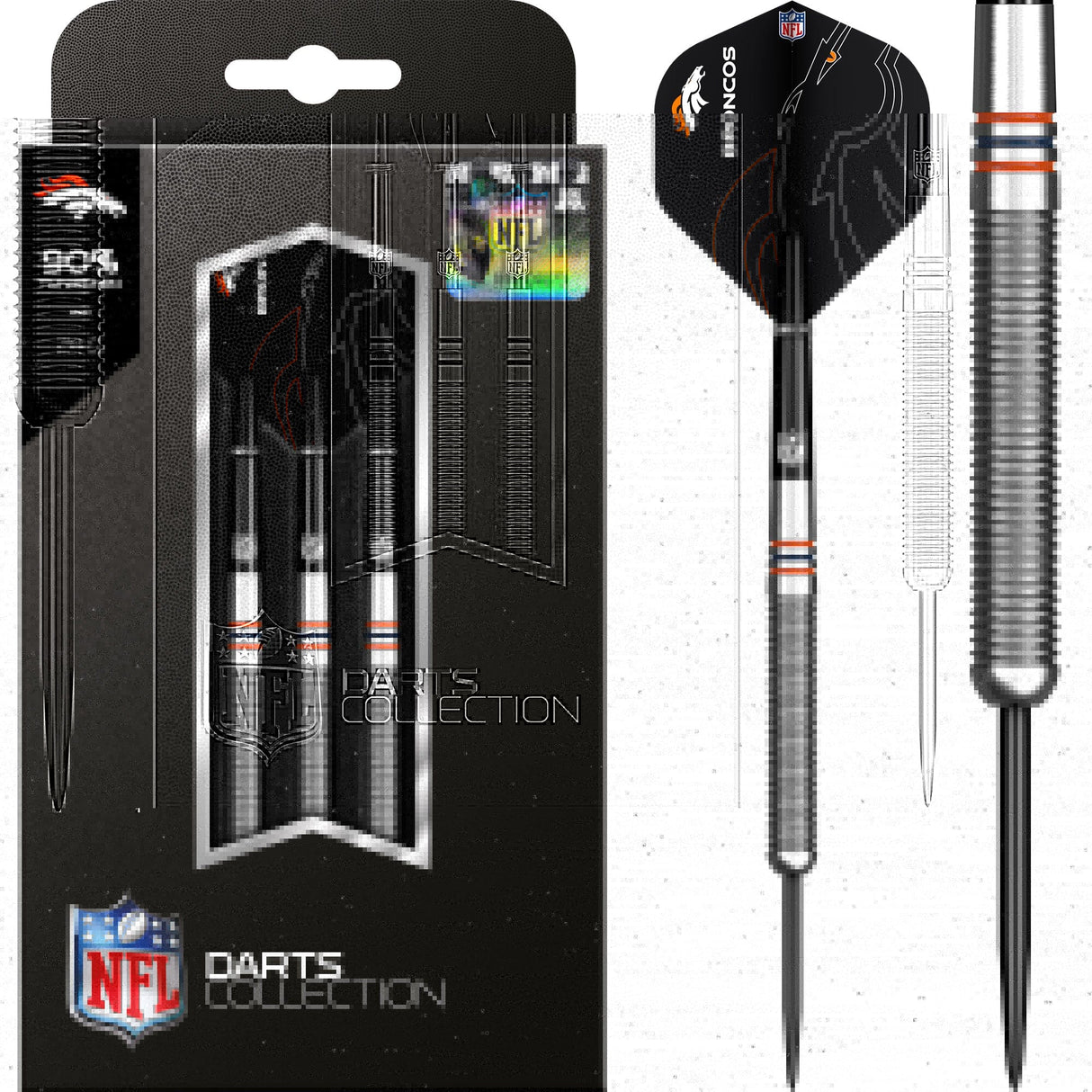 Officially Licensed NFL Steel Tip Darts - 90% Tungsten. Includes: 90% Tungsten Barrels, NFL Licensed Flights, 1 Set of Nylon Shafts with rings, Point Protector NFL - Steel Tip Tungsten Darts - Official Licensed - Denver Broncos - 24g steel tip