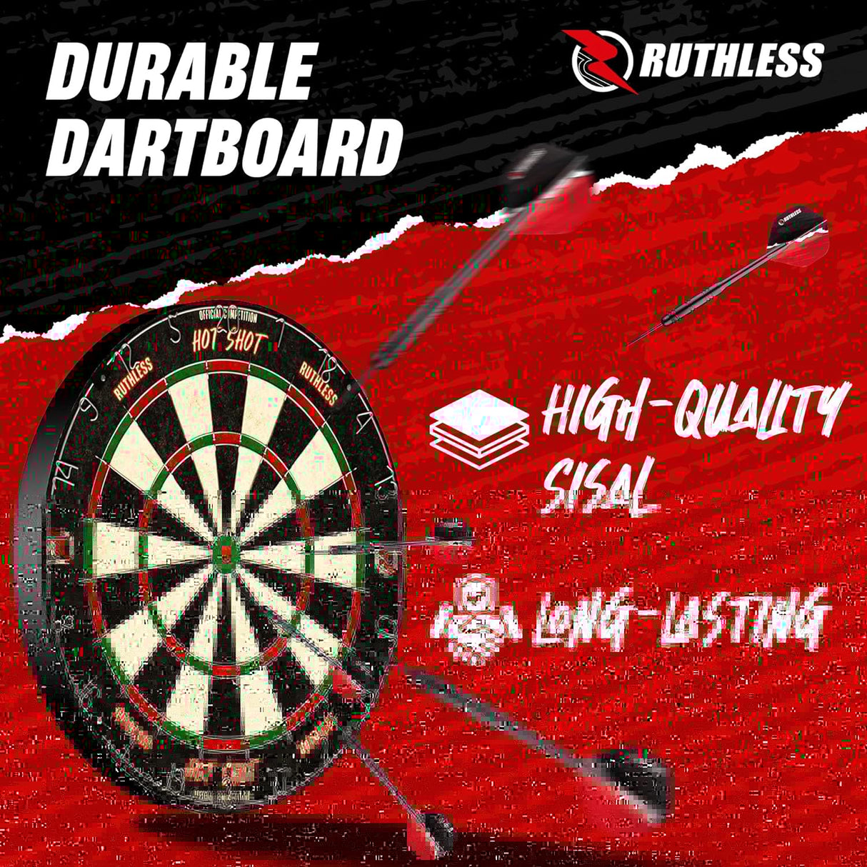 Ruthless Animal Home Darts Centre - Hotshot Dartboard in Cabinet - Dragon. Ruthless home darts centre includes dartboard, cabinet and 2 sets of darts. Quality 2 sided home and away easy-wipe scoring panels and strengthened back panels and pens Protect your dartboard and surroundings in a hide-away design. These cabinets come complete with fixings and fitting instructions for easy set up and play.