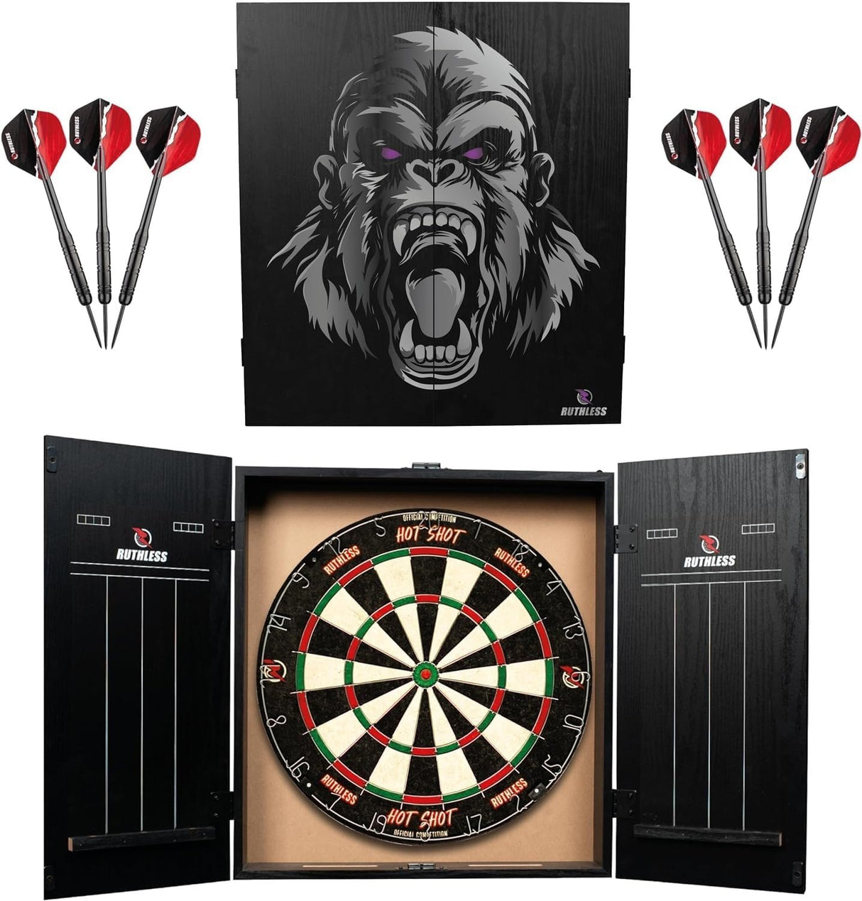 Ruthless Animal Home Darts Centre - Hotshot Dartboard in Cabinet - Gorilla. Ruthless home darts centre includes dartboard, cabinet and 2 sets of darts. Quality 2 sided home and away easy-wipe scoring panels and strengthened back panels and pens Protect your dartboard and surroundings in a hide-away design. These cabinets come complete with fixings and fitting instructions for easy set up and play.