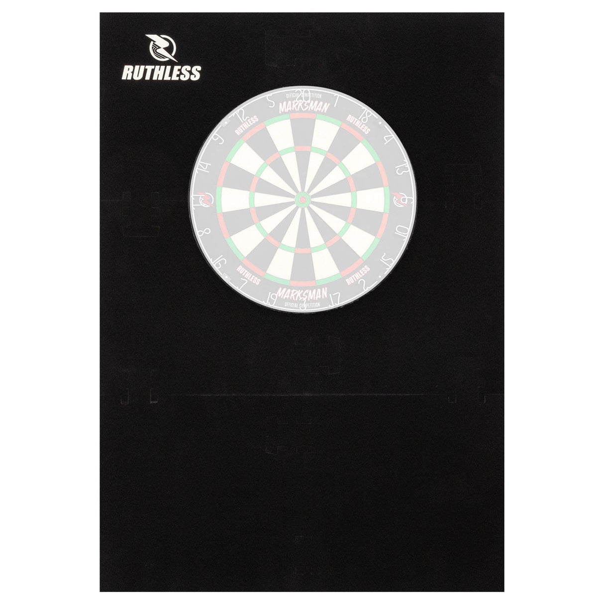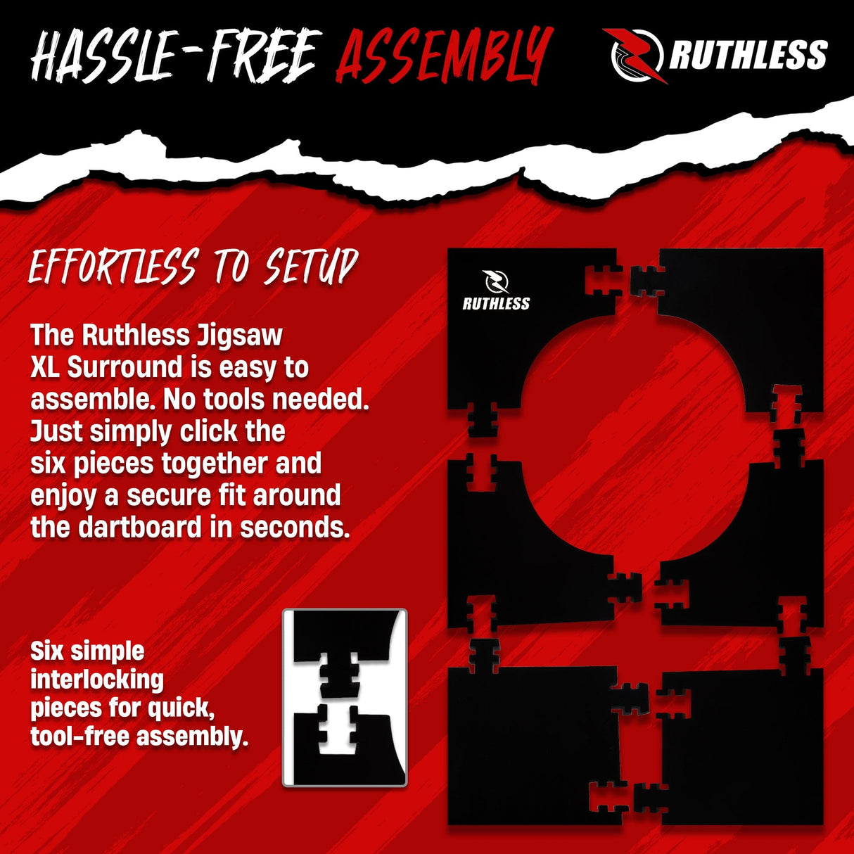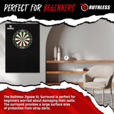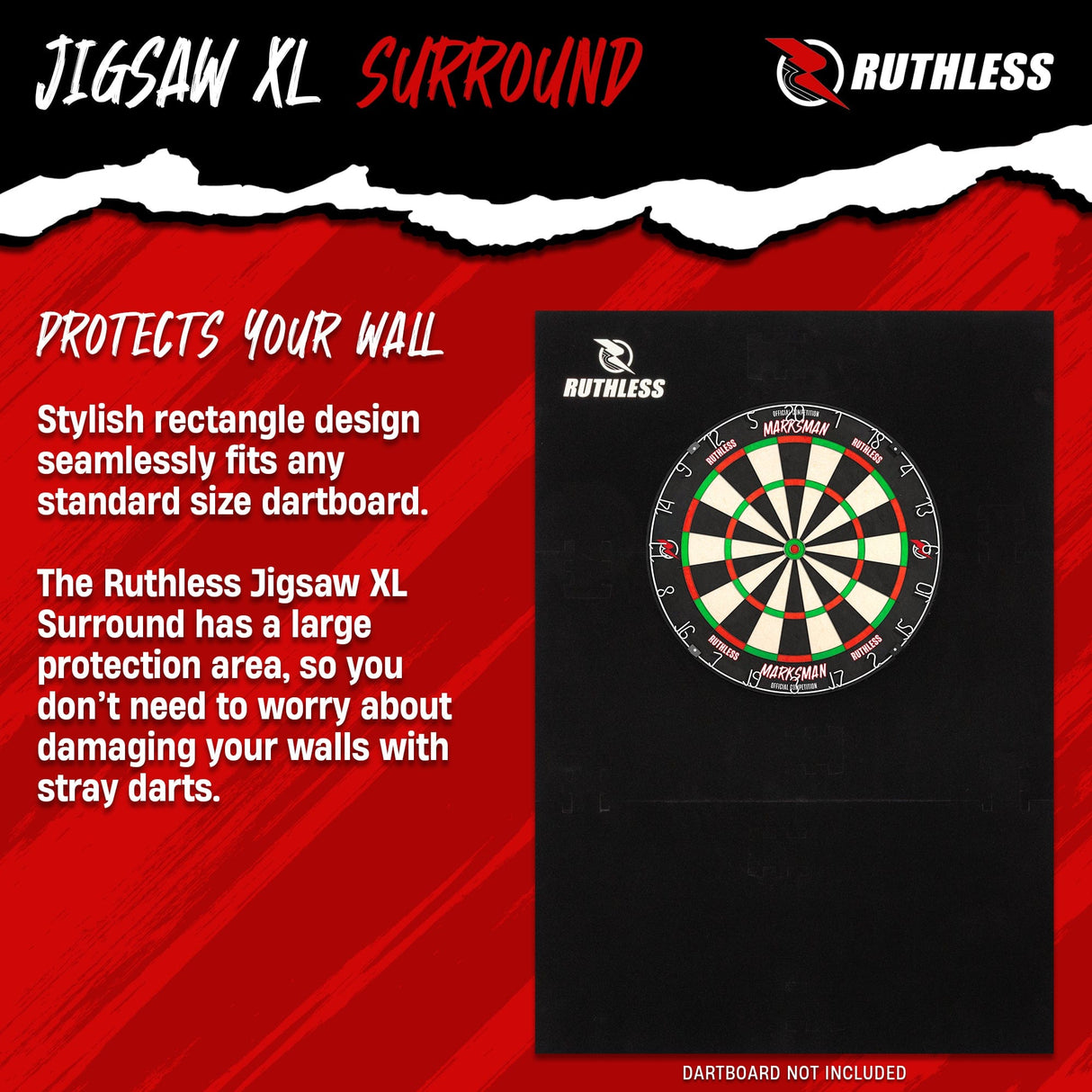Ruthless XL Jigsaw Surround - EVA Dartboard Surround - Black. Stylish rectangle design fits any standard-sized dartboard. The Ruthless Jigsaw XL Surround has a large protection area, so you don't need to worry about damaging your walls with stray darts. The Ruthless Jigsaw XL Surround is easy to assemble, no tools required. Simply click the 6 pieces together and enjoy a secure fit around the dartboard in seconds.