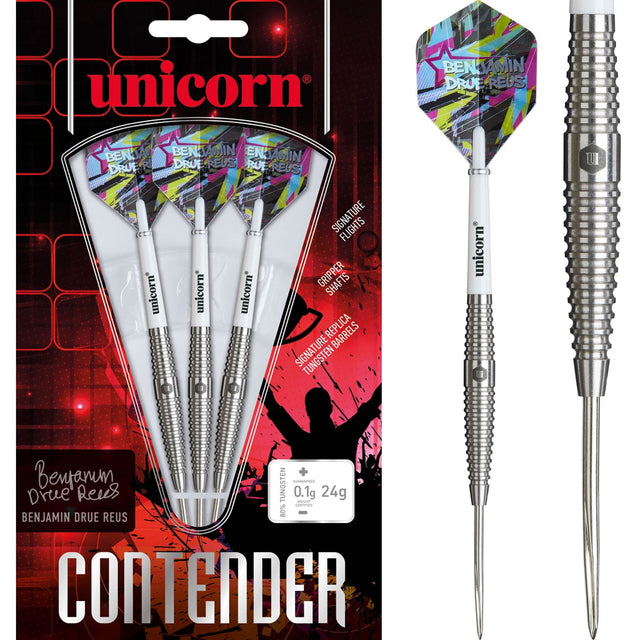 Unicorn Contender Darts - Steel Tip - 80% Tungsten - Benjamin Drue Reus - 24g is backordered and will ship as soon as it is back in stock.