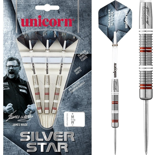 Unicorn Silver Star James Wade 80% Tungsten Darts. Features: 80% Tungsten Nickel Alloy, Precision engineered barrels, Matched Weight Series - set of 3 barrels within 0.1g, Gripper Shafts.